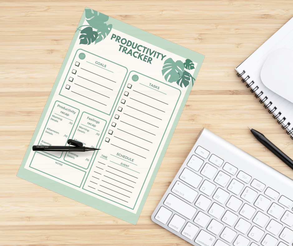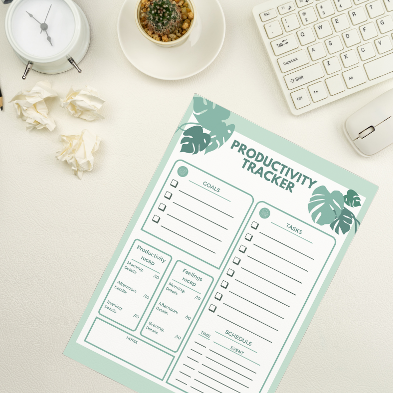 Featuring dedicated sections for goal-setting, task management, schedule planning, productivity recap, feelings recap, and additional notes, our Productivity Tracker empowers you to take control of your day and optimize your workflow for maximum efficiency.