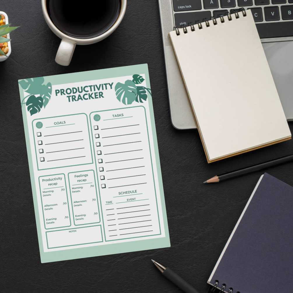 Featuring dedicated sections for goal-setting, task management, schedule planning, productivity recap, feelings recap, and additional notes, our Productivity Tracker empowers you to take control of your day and optimize your workflow for maximum efficiency.